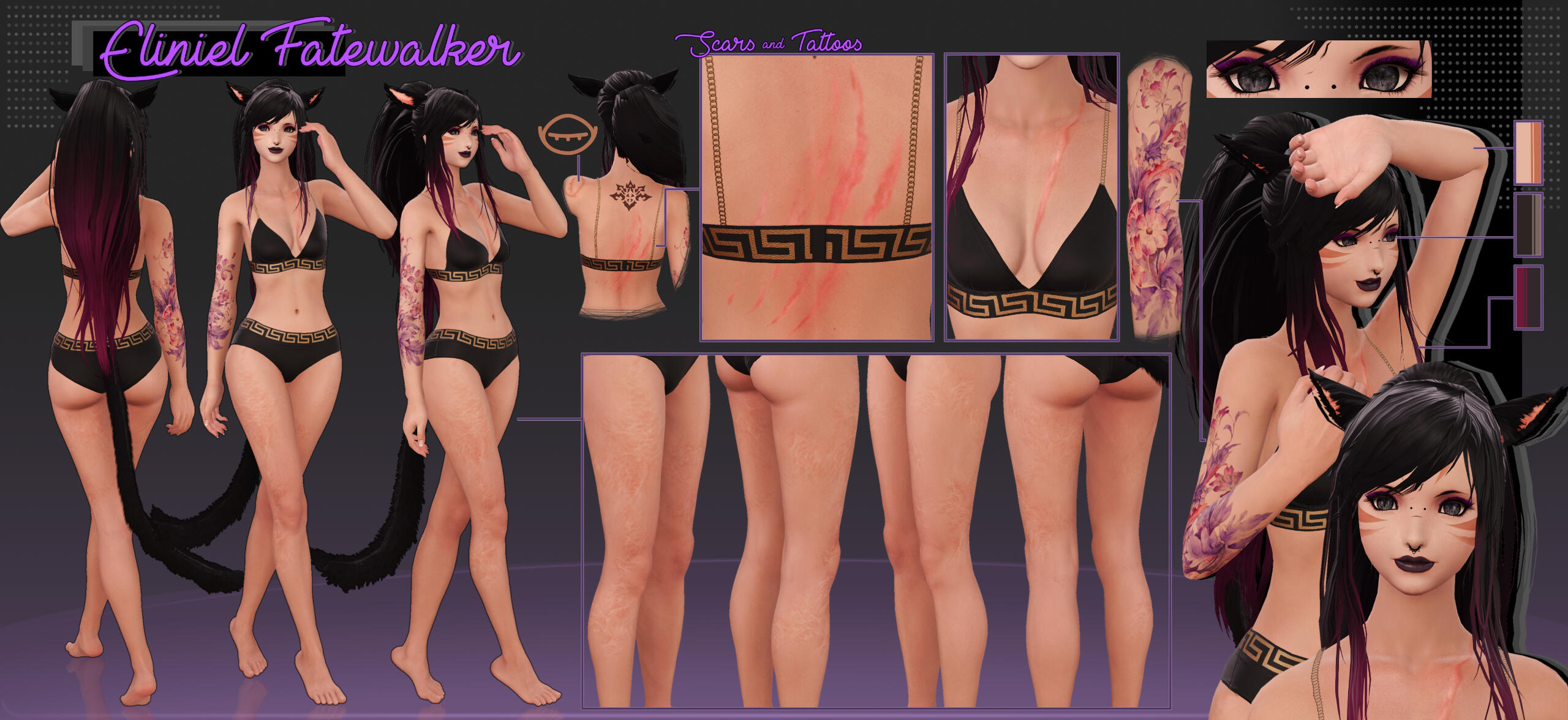 After being thrown through time, Eli was almost immediately thrust back into the position of Warrior of Light without a moment to catch her breath. She is also thrown for a loop when none of her previous companions recognize her, especially Thancred.However, most everything happens as it does in canon until she gets to the Bowl of Embers for the first time.Unable to truly orient herself to this new world, get her bearings, and still reeling from her confusion, she still faces the Lord of the Inferno against her better judgement. She is able to defeat him with the help of her party members, but after firing off a too-powerful attack spell, Ifrit's attention turns to her. She turns to run much to late, and he swipes his gigantic fiery claws across her back, burning her thighs and leaving a long gash across her back.Her healer was able to stopper her wounds so Thancred was able to get her back to the closest Aetheryte and to a doctor. She had an extended stay in the infirmary at Drybone, where she spent weeks healing with Thancred at her side, whom she forced to keep quiet about the scars, much to his dismay.After the Praetorium, when the veil was lifted and the Scions remembered who she was again, Thancred apologizes profusely to Eli for not being able to recognize her and, for a very long time, regrets his role to play in her receiving those scars.